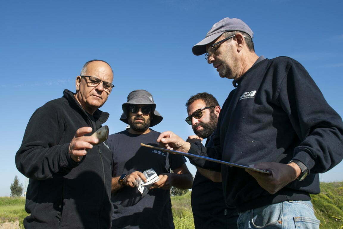 מנהל רשות העתיקות אלי אסקוזידו בוחן כלי קיצוץ קדום שהתגלה בחפירה. צילום: יולי שוורץ, רשות העתיקות